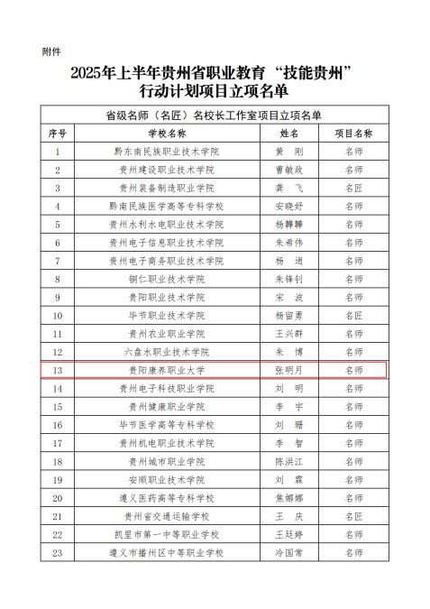 贵州省职业教育“技能贵州”行动计划项目——省级张明月名师工作室项目获立项