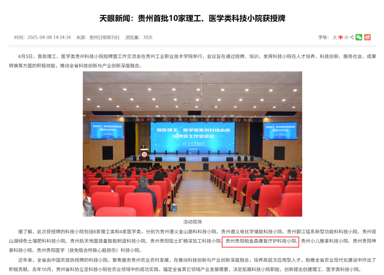 图片贵州贵阳帕金森康复医疗科技小院获授牌