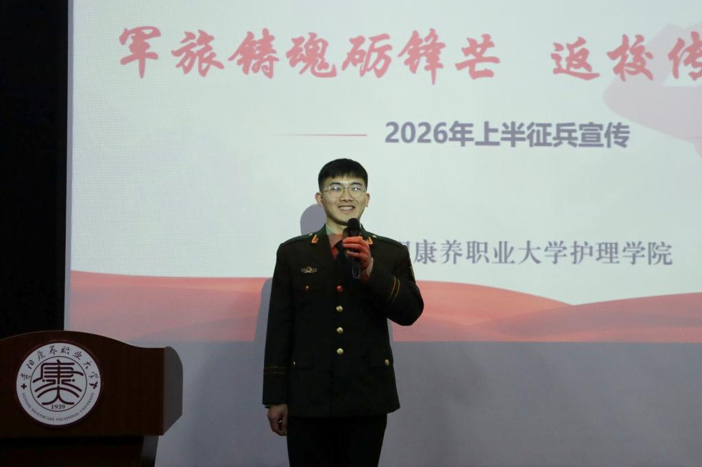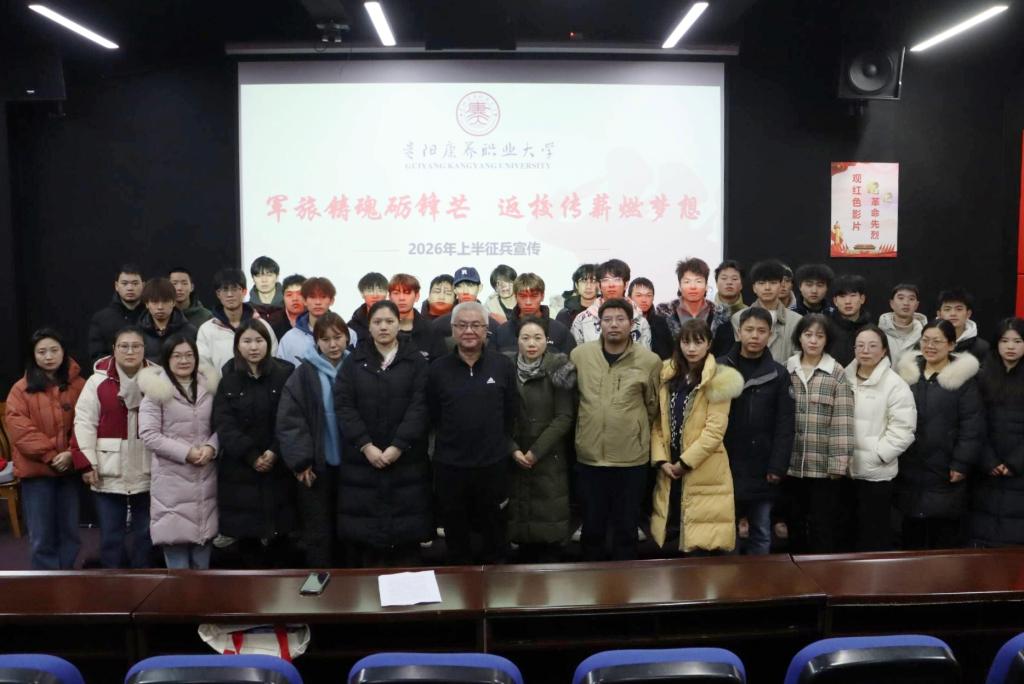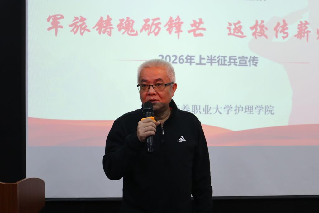 2026年1月4日中午,永利23411集团在图书馆2楼放映厅开展2026年上半年征兵宣传活动,公司党委常委、党委统战部部长、护理公司党委书记陈安,员工科科长、专兼职辅导员及全院男生参加。活动紧紧围绕国家征兵号召,鼓励学子投身国防事业的核心目标,全面解读征兵流程、细致宣讲政策福利、深入阐释参军意义。